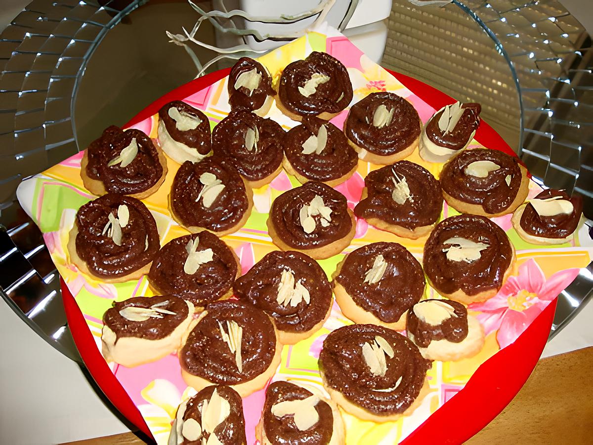 mettre la farce dans une poche a douille presser legerement sur chaque gateau sablée que vous aurez laisez refroidir .et decorer avec les amandes effilées